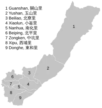 Nanhua ist in neun Ortsteile (里, Lǐ) untergliedert:[7] Guanshan (關山里), Yushan (玉山里), Beiliao (北寮里), Xiaolun (小崙里), Nanhua (南化里), Beiping (北平里), Zongken (中坑里), Xipu (西埔里) und Donghe (東和里).