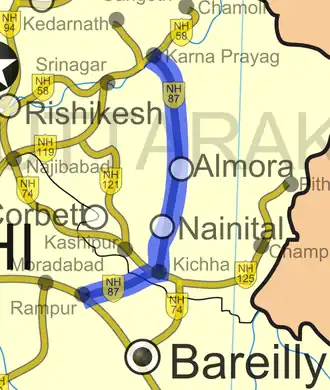 Die NH 87 geht durch Patnagarh, Haldwani, Nainital, Bhowali, Almora, Ranikhet, Dwarahat, Chaukutia, Gairsain, Adi Badri und Karna Prayag.[4]