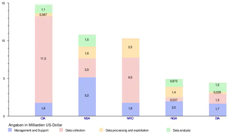 79. The Black Budget. Covert action. Surveillance. Counterintelligence. The U.S. “black budget” spans over a dozen agencies that make up the National Intelligence Program. The Washington Post, 30. August 2013, abgerufen am 7. September 2013 (englisch).
