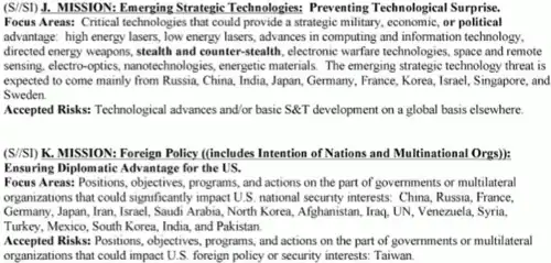 Laut einer als geheim eingestuften Liste von Snowden führt die NSA Deutschland als Spionageziel bei den Themen deutsche Außenpolitik, ökonomische Stabilität, Gefahren für die Finanzwirtschaft, Waffenexporte, neue Technologien, hochentwickelte konventionelle Waffen und den internationalen Handel.[52]