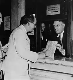 Ausgabe der ersten Duck Stamps 1934 an Jay Norwood Darling, Leiter des Bureau of Biological Survey und Erfinder der Duck Stamps