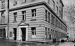 1920/21 bildete die 'Nationalbank für Deutschland' mit der Darmstädter Bank für Handel und Industrie die "Bankengemeinschaft Darmstädter-Nationalbank Berlin". Beide Banken übernahmen eine gegenseitige Garantie für Kapital und Reserven in Höhe von über einer Milliarde Mark. Die nebenstehenden Bilder zeigen eine im Mai 1922 in Lübeck neueröffnete Zweigniederlassung. In den dortigen Zeitungen hieß es in jener Zeit, dass die Räume ursprünglich für eine Filiale der Darmstädter Bank vorgesehen waren. Da die Banken aber eine Interessengemeinschaft gebildet hätten, konnten deren Interessen in der Hansestadt durch die Nationalbank vertreten werden.[1] Die beidseitigen Bestrebungen, dass im selben Jahr die vollständige Fusion zur Darmstädter und Nationalbank KG a. A. (Danat-Bank) erfolgen würde, wurde zu jenem Zeitpunkt verschwiegen.