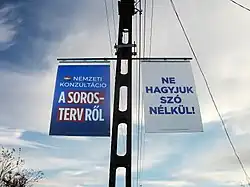 Die Orbán-Regierung versendete im April 2017 einen Fragebogen an Millionen von wahlberechtigten Ungarn, um angebliche Flüchtlingspläne des ungarischstämmigen US-Milliardärs George Soros zu diskreditieren. „Rechtlich bindend ist die Befragung nicht“.[3]