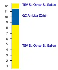 | 8. | GC Amicitia Zürich | 18 | 5 | 3 | 10 | 486:489 | −3 | 13:23 | |