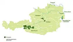 Drei Nationalparks schützen Gebirgsregionen (Hohe Tauern, Gesäuse und Kalkalpen) und drei Nationalparks Gewässer (Neusiedler See – Seewinkel, Thayatal und Donauauen).