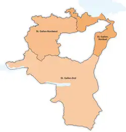 Gemäss dem «Bundesgesetz betreffend die eidgenössischen Wahlen und Abstimmungen» vom 19. Juli 1872 erfolgte eine Anpassung des Gebiets, als zwei Gemeinden im Bezirk Werdenberg an den Wahlkreis St. Gallen-Nordost abgetreten wurden.[3] St. Gallen-Süd umfasste somit: