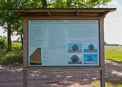 Das Naturdenkmal Krügersdorfer Eichen bestand bisher aus fünf Stieleichen, die etwa 350 Meter westlich von Krügersdorf im Landkreis Oder-Spree (Brandenburg) an der B 246 stehen. Die Huteeichen sind Teil einer alten Allee, die von Krügersdorf nach Beeskow führt, und rund 550 bis 600 Jahre alt sein dürften.[1] Die stärkste der Eichen, die Dicke Eiche, ist etwa 22 Meter hoch und hat einen Stammumfang von 10,45 Metern.[2] Um Radwandern und Touristen die Gelegenheit eines Besuchs der Eichen zu ermöglichen, wurde ein Rastplatz (⊙) mit Informationstafeln eingerichtet.