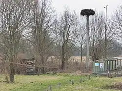 Hinter den Hofgebäuden wird in praktischen Beispielen im Freiland gezeigt, was jeder Einzelne für den Naturschutz beitragen kann. Auf dem Freigelände, neben dem ein sehr großer Stahlgittermast einer Elektrofreileitung platziert ist, führen die Mitarbeiter unter anderem Storchenbeobachtungen durch und eine Tafel informiert die Besucher über die Ankunft der Vögel, die Anzahl der ausgebrüteten Jungtiere und die Abflugzeit. Leider wurde dabei auch festgestellt, dass die Jungstörche häufig an den Stahlteilen des Mastes verunglücken – von Brüchen bis zu tödlichen Abstürzen.