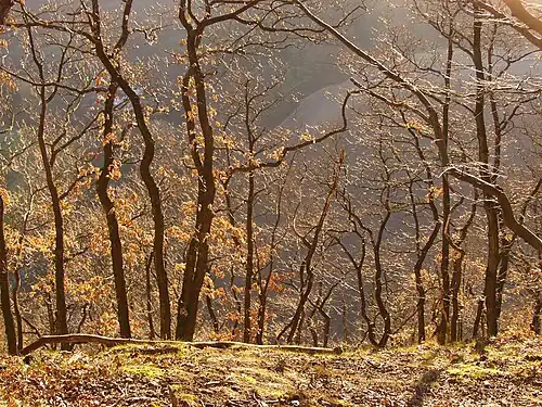 Naturschutzgebiet Bilstein (Ennepetal): Krüppeleichen im Winter vom Kopf des Bilsteines mit Blick auf das Tal der Ennepe (Februar 2008)