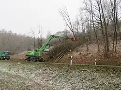 Im März 2021 wurden mit einem Fällbagger von der Straße aus absterbende Eschen, die wegen der Verkehrssicherheit entfernt werden mussten, und alle anderen großen Bäume in Falldistanz zur Straße zu entfernen. Der Fällbagger hatte einen Ausleger von 15 m. Die Hydraulikscherre konnte bis 35 cm Stärke alles abschneiden und auch gleich zur Seite heben. Bei über 35 cm Stammstärke haben die Greifer den Baum gehalten und mit der Motorsäge von einem Mitarbeiter der Biologische Station abgesägt. Zuerst scherrte der Bagger aber in 6 bis 8 m den oberen Teil des Baumes ab und hob ihn beiseite. Bei einigen ganz großen Bäumen wurde der Baum gehalten und zuerst ein Fällkerb mit der Motorsäge geschnitten. Nach dem absägen wurde der Baum dann Richtung Hang umgedrückt und dann in per Hydraulikscherre zerteilt. Die abgescherrten Bäume packte der Baggerfahrer auf Haufen. Später wurden die Bäume gehäckselt.[2]