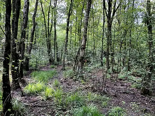 In anderen Waldbereichen befinden sich trockenere Erlenwälder, Eichen-Birkenwälder und Bereiche mit standortfremden Gehölzen. Der nördlich des Weges gelegene artenreiche Bruchwald ist von einem quelligen Rinnsal durchzogen.