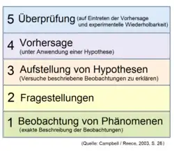 Die theoretischen Methoden der Naturwissenschaften sowie ihre Voraussetzungen und Ziele werden in der Wissenschaftstheorie beschrieben und diskutiert. Sie basieren hauptsächlich auf Mathematik, Logik und Erkenntnistheorie, aber auch auf kulturell geprägten methodischen und ontologischen Vorannahmen,[11] die Gegenstand naturphilosophischer Reflexion sind.[12] Die Zielsetzung der Naturwissenschaften – die Erforschung der Natur – setzt als metaphysische Grundannahme voraus, dass die Natur existiert und dass natürliche Vorgänge gesetzmäßig ablaufen.[13][14] Weiterhin gehen Naturwissenschaftler von der erkenntnistheoretischen Prämisse aus, dass die systematische Generierung von Wissen über die Natur innerhalb bestimmter Grenzen möglich ist.[15] Zu der Frage, wo genau diese Grenzen liegen, gibt es verschiedene Standpunkte, deren gängigste Varianten grob in zwei Gruppen aufgeteilt werden können, die empiristische Position und die Position des wissenschaftlichen Realismus.[16] Empiristen gehen davon aus, dass sich die Möglichkeit wissenschaftlicher Erkenntnis auf empirische Beobachtungen beschränkt.[16] Theorien bzw. Modelle ermöglichen hingegen dem Empirismus zufolge keine Aussagen über die Natur. Eine mit dieser Auffassung verbundene Schwierigkeit ist die Abgrenzung zwischen empirischer Beobachtung und theoretischen Aussagen, da die meisten Beobachtungen in den Naturwissenschaften indirekt sind.[17] Beispielsweise sind elektrische Felder, Atome, Quasare oder DNA-Moleküle nicht direkt beobachtbar, vielmehr lassen sich die Eigenschaften dieser Objekte nur unter Anwendung komplexer experimenteller Hilfsmittel ableiten, wobei der theoretischen Interpretation der gemessenen Daten eine unverzichtbare Rolle zukommt.