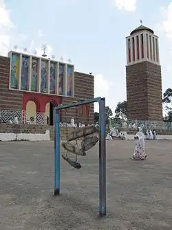 Die Anlage nimmt den westeuropäischen Typ der Doppelturmfassade auf, zerlegt ihn jedoch in drei Bauteile: Die Mitte bildet der kubische, massive Block des Kirchenschiffs, der von zwei freistehenden Kirchtürmen flankiert wird. Als oberer Abschluss der Türme dienen Pavillons, die klassischen afrikanischen Rundhütten, Tukuls, nachgebildet sind. Zwischen beiden Türmen führt eine Treppe auf eine Plattform, auf der das Kirchenschiff steht, in das zwei Türen führen. Das äußere Erscheinungsbild von Schiff und Türmen wird durch sich abwechselnde Lagen von Bruch- und Backsteinen geprägt. Damit sollen aksumitische Architekturelemente aufgenommen worden sein. An der Westfassade, über dem Eingang, wurden 1938 sieben hochformatige monumentale Mosaike, die religiöse Szenen darstellen, ergänzt. Darüber befinden sich sieben aksumitische Kreuze.