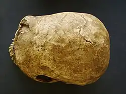 Das Gehirnvolumen der Neandertaler betrug rund 1200 bis 1750 Kubikzentimeter[68] (im Mittel rund 1400 cm³), was im Durchschnitt etwas größer ist als beim heutigen Menschen und als eine Folge ihres insgesamt kräftigeren Körperbaus gedeutet wird. Diese Variationsbreite hatte zur Folge, dass auch andere Merkmale des Schädels von Neandertalern eine erhebliche Variationsbreite aufweisen. Gleichwohl gibt es zahlreiche Merkmale, die sich von jenen des anatomisch modernen Menschen unterscheiden und die sich zudem nicht erst nachgeburtlich herausbildeten, sondern bereits vorgeburtlich angelegt waren;[69] dies konnte am Schädel des Neandertaler-Babys aus der Mesmaiskaja-Höhle (Kaukasus) belegt werden.[70]