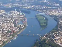 - Luftaufnahme der beiden Rheininseln, zwischen denen der Steindamm aufgeschüttet wurde