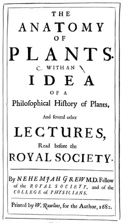 Am 11. Mai 1671 wurde Grews erste Schrift über Pflanzenanatomie The anatomy of vegetables begun dem Council der Royal Society vorgestellt und der Druck derselben beauftragt. Das Werk erschien Ende 1671 und enthielt drei Tafeln mit 29 Abbildungen, darunter eine mit dem Mikroskop angefertigte Querschnittszeichnung des Stängels einer Klette (Abbildung 15).[4] 1673 erschien An idea of a phytological history propounded in dem Grew die verschiedenen Methoden auflistete mit denen Pflanzen untersucht werden könnten. Außerdem beschäftigte er sich darin mit der Anatomie der Wurzeln. Zwei Jahre später folgten mit The comparative anatomy of trunks seine Untersuchungen über die vergleichende Anatomie der Stängel. Am 22. Februar 1682 ordnete der Council der Royal Society an Grews bisherige Schriften und unveröffentlichte Vorträge zur Pflanzenanatomie in einem Band zu drucken.[5] Darunter befinden sich Vorträge über die Anatomie der Blätter und Blüten aus dem Jahr 1676 sowie der Früchte und Samen aus dem Jahr 1677. Weitere sieben Vorträge aus dem Zeitraum 1674 bis 1677 ergänzen das unter dem Titel The anatomy of plants veröffentlichte Werk.