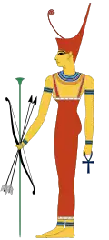 Neith wird häufig in menschlicher Gestalt mit Pfeil und Bogen in den Händen und der Roten Krone Unterägyptens auf dem Kopf dargestellt.[1] Im Text Esna 427 findet sich eine ausführliche Beschreibung der Göttin: