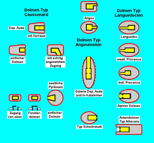 Dolmen, deren seitliche Längsplatten etwas zu kurz waren, wurden mit Trockenmauerwerk ergänzt. Es erscheint plausibel, dass die Dolmenerbauer in Regionen ohne Plattenmaterial auf die Idee kamen, die Längsplatten durch Trockenmauerwerk zu ersetzen. Dazu passt auch, dass der Typ „bas-rhodanien“ schon immer für eine späte Erscheinung gehalten wurde.