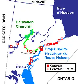 Karte mit Zuleitung von Wasser des Churchill River, sowie Lage der Wasserkraftwerke am Nelson River | ||