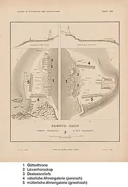 - ↑ a b Donald H. Sanders, Theresa Goell, John H. Young: Detailed Site Description: East Terrace, West Terrace, North Terrace. In: Donald H. Sanders (Hrsg.): The Hierothesion of Antiochos I of Commagene. Eisenbrauns, Winona Lake, Ind. 1996, ISBN 1-57506-015-9, S. 127–130.