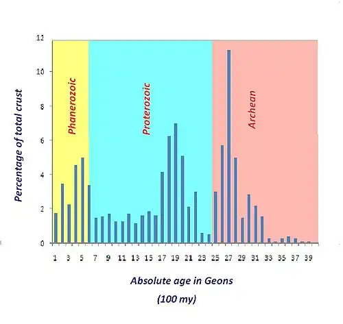 Dieses enorme Krustenwachstum wurde von Taylor und McLennan (1985) auf rund 40 % des heutigen Krustenbestandes eingeschätzt. Ihnen zufolge soll sich die Erdkruste ausgehend von 30 % des heutigen Werts bei 2700 Millionen Jahren auf 70 % bei 2500 Millionen Jahren ausgedehnt haben.[5] Modellrechnungen zeigen, dass fast 100 % der kontinentalen Kruste bereits um 2500 Millionen Jahre oder schon etwas früher geformt worden war[6] – und sämtliches später erfolgende Anwachsen durch die Effekte Subduktion/Erosion ausbalanziert wurde.[7]