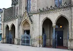 Flankiert wird der Turmeingang von Doppelspitzbögen auf zentralen Säulen mit Blattmasken-Kapitellen, die sich zu den ehemaligen neogotischen Seitenschiffen öffnen. Hinter dieser Vorhallenkonzeption tritt die Abschlusswand des Langhauses zurück. Die Vorhallenfront wird mit dem Langhaus durch die Schrägwände des sechseckigen, strebepfeilerumstandenen Turmes verbunden. Während das Turmuntergeschoss Teil der dreiteiligen Vorhalle ist, verbindet sich das erste Turmgeschoss in seiner Gestaltung mit der Langhausfassade. Die beiden zweibahnigen Spitzbogenfenster mit Vierpass in der Spitze entsprechen im ersten Geschoss formal dem Turmfenster auf gleicher Ebene. Alle drei Fenster weisen die gleiche Höhe auf wie die Blendspitzbögen der Turmschrägwände. Die Langhausfassade wird im ersten Geschoss mit einer Maßwerkbrüstung abgeschlossen. Das zweite Turmgeschoss zeigt in der Mitte ein gerade abschließendes zweibahniges Fenster, über dem die Turmuhr angebracht ist. Die Schrägwände sind wie im ersten Turmgeschoss mit Blendspitzbögen gegliedert. Über den neogotischen lanzettenartigen Schallöffnungen des Turmes steigt der sechseckige, krabbenbesetzte Spitzhelm hinter einer Maßwerkbrüstung steil auf.