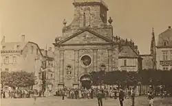 Die neogotische Kirche St. Ludwig und St. Peter und Paul war der Nachfolgebau der barocken Stadtkirche von Saarlouis sowie der Vorgängerbau der gleichnamigen heutigen katholischen Kirche am Großen Markt in Saarlouis. Die Pfarrgemeinde wurde im Jahr 1685 im Zusammenhang mit der Anlage der Festung Saarlouis gegründet. Der Bau der katholischen Kirche geschah im Zusammenhang mit der Anlage der Festung Saarlouis durch den französischen König Ludwig XIV. und ist auch im Zusammenhang mit den Rekatholisierungsmaßnahmen Ludwigs XIV. im Gefolge der Reunionspolitik an der mittleren Saar in der zweiten Hälfte des 17. Jahrhunderts zu sehen.[1] Der ehemals barocke Bau erfuhr im Laufe seiner Geschichte zahlreiche Umgestaltungen. So wurde im 19. Jahrhundert in zwei Etappen der Barockbau durch einen neogotischen Neubau ersetzt. Dessen Kirchenschiff wurde im 20. Jahrhundert durch einen Betonbau im Stil des Brutalismus ersetzt. Vom neogotischen Bau hat sich bis heute die Turmfront erhalten.