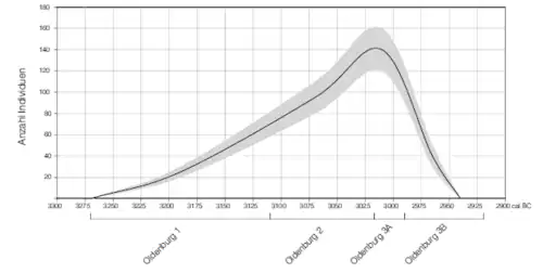 Wie viele Häuser letztlich gleichzeitig existierten, ist nicht bekannt. Im linearbandkeramischen Modell wird eine Hausgeneration auf 25 Jahre geschätzt (s. Hofplatzmodell). Übertragen auf Oldenburg bedeutet dies, dass in der Phase 1 zwei bis drei Häuser gleichzeitig existierten, in der Phase 2 elf Häuser und fünf bis sechs Hütten, in der Phase 3A 16 Häuser und zehn bis elf Hütten und in der Phase 3B vier bis fünf gleichzeitige Häuser. Diese Zahlen erscheinen in Anbetracht der dendrodatierten Befunde der alpinen Seeufersiedlungen realistisch[11].