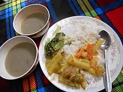 Suppenähnliches Dal und in Soße gekochtes Gemüse können in getrennten kleinen Schalen serviert werden, um über den Reis gegossen zu werden. Das Essen wird mit den Fingern der rechten Hand zum Mund geführt, die linke Hand darf das Essen niemals berühren, kann jedoch Becher und Gläser halten. Die rechte Hand wird vor und nach dem Essen gewaschen.