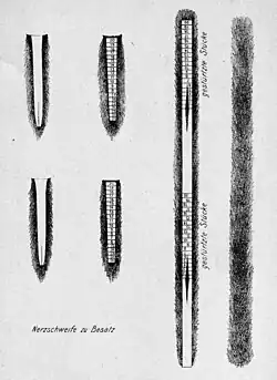 Kragen aus Nerzschweifen werden seltener hergestellt, es sei denn, daß ein Mantel mit Nerzschweifen besetzt, einen vollen Kragen aus diesem Material bekommen soll. Es lassen sich Kragen aus Nerzschweifen nach drei verschiedenen Methoden herstellen. Erstens, indem man die Spitzen alle nach unten laufen läßt, zweitens umgekehrt die Schwanzwurzel nach unten, und drittens so, daß die Schweife von der Achsel aus nach vorn und hinten laufen. Die erstere Art ist die bevorzugte, nur ist dabei, um unten die Weite zu erzielen, notwendig, daß die Spitzen der Schweife 1–2 mal gespalten werden, damit Galonen nicht nur neben, sondern auch zwischen die Schweife gesetzt werden können. Kommen die Spitzen nach oben, so hat der Schweif schon eine solche Form, daß wenig Galonen nötig sein werden. Die dritte Art, daß sich die Schweife von der Achsel aus teilen, wird auch den Spitzen zu stets Galonen erfordern und je nach Façon auch neben und zwischen den Schweifen. Mehr als zu Kragen werden Nerzschweife zu Besatz verwendet und sowohl einfach, wie mehrfach nebeneinander laufend, verarbeitet. Am meisten dürften dieselben aber als sogenannte „Rolle“ oder Einfassung Verwendung finden; es wurde zu diesem Zweck einfach immer einer auf den anderen gesetzt. Man fand aber, daß die dunkle Spitze auf die hellere Schweifwurzel nicht immer Anklang fand, und so entschloß man sich denn, einen Schweif einer solchen Bordure ganz zu lassen und den nächsten immer in kleine Stückchen zu schneiden, so daß die Spitze wieder an die Spitze des nächsten Schweifes zu stehen kam und doch im Haarstrich sich nicht gegeneinander stieß, sondern laufenden Besatz darstellte, wie Abbildung Tafel 76 veranschaulichen wird. Ist diese Arbeit auch sehr mühsam, so befriedigt sie doch, wenn schön ausgeführt, das Auge ungemein und erhöht den Wert eines solchen Besatzes. In die Spitzen der Schweife müssen, des gleich breiten Aussehens wegen, noch kleine Galonen in Keilform eingesetzt werden. (Siehe die Zeichnung.)“