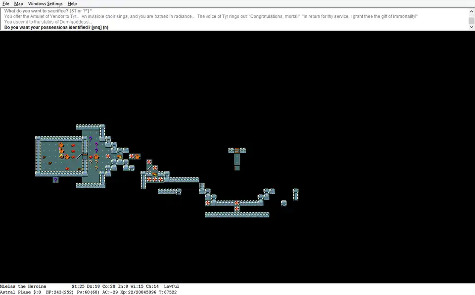 Der Spieler hat als Walküre das Ende in den Astralen Ebenen erreicht und ist in den Status eines Halbgottes aufgestiegen, die sogenannte Ascension. Das Spiel fragt „Do you want your possessions identified?“ (deutsch: „Willst du deinen Besitz identifiziert haben?“). Ein Satz, der auch beim Ableben der Spielerfigur angezeigt wird.