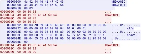 | NBD_OPT_EXPORT_NAME | 1 | Client wählt Namen des Blockgerätes: der Name folgt im option_data-Feld. Diese Option beendet automatisch die Optionsliste. Der Server schickt den geräteabhängigen Teil der Initialisierung (siehe unten).