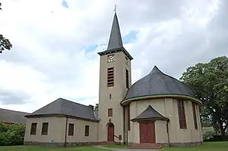 Die Dorfkirche Neu Lübbenau entstand im Jahr 1939. Das Dach des Kirchenschiffs ist als kieloben liegendes Boot gestaltet.