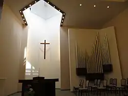 Der Altar wurde auf einem Podest installiert. Er ist als leicht gegliederter dunkel gebeizter kompakter Mahagonitisch ausgeführt. Zum Podest führen in ganzer Raumbreite drei Stufen aus Marmor, ein kleiner Bereich der Treppe ist in Dreieckform zum Besucherraum vorgezogen. Er wiederholt damit die schon erwähnte Dreiecksform an der Fassade, am Portalbereich und die Form des Eckbaus. An einer der Wände ist ein hölzernes Kreuz montiert.
