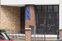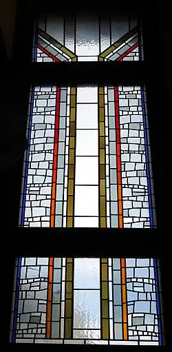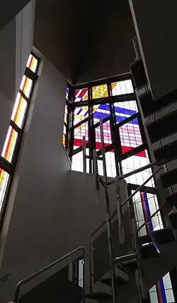 Dem Haupthaus schließt sich ein spitzgiebeliges turmähnlich aufragendes Treppenhaus an, das die bauliche Verbindung zwischen dem Haupthaus und der Empore im Anbau bildet. Von hier gelangen die Besucher in die Mehrzweckräume und auf die Empore. Auf die christliche Nutzung des Gebäudes verweist die Aufschrift an dem geklinkerten Eckteil: Neu-Apostolische Kirche unter dem großen typischen NAK-Kirchensymbol. In der zweiten Etage befinden sich Wohnungen.[10]