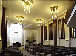 An der flachen Decke des Hauptraumes sind stabförmige Beleuchtungskörper angebracht, die in abgestufter Form zu rechteckigen Gruppen zusammengefasst sind und damit moderne Kronleuchter simulieren. Als Gegenstück zu den Fenstern haben die Architekten die südöstliche Wand des Kirchenraumes mit fensterhohen Spiegeln verkleidet, die somit eine zweite Fensterreihe simulieren und weiteres Tageslicht hierher lenken. – Die im Kirchenraum sichtbaren Stützen sind wie flache Säulen zwischen die Fenster bzw. Spiegel eingebaut und mit Holz verkleidet.