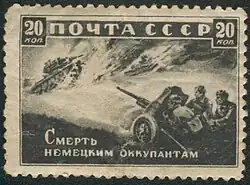 - Briefmarke mit Nennwert 20 Kopeken von 1942: Russische Pak schießt auf zwei Neubaufahrzeuge.
