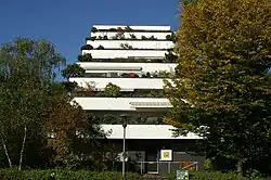Das Deutschordens-Wohnstift Konrad Adenauer e. V. unterhält am Straßburger Platz ein Wohn- und Pflegeheim mit vier dem individuellen Pflegebedarf angepassten Wohnkomplexen. Den rund 350 Bewohnern wird eine integrierte gerontopsychiatrische Betreuung angeboten. Neben den üblichen Pflegeeinrichtungen stehen den Bewohnern ein Thermalbad und eine Gebetskapelle zur Verfügung.[30] Der Grundstein für das Hauptgebäude des Wohnstiftes wurde am 7. September 1974 durch Kardinal Joseph Frings gelegt; die Einweihungsfeier fand am 31. Januar 1976 statt.[3]