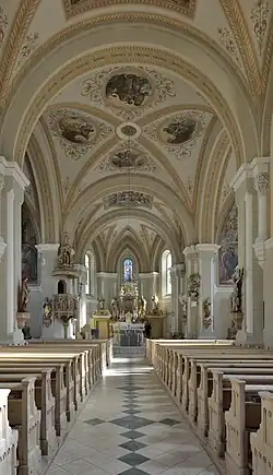 Die in historisierenden Formen errichtete Kirche ist ein Langhausbau mit einem Querschiff. Der Kirchturm ist im Norden seitlich angebaut. Das Portal ist wie zahlreiche andere Details neuromanisch gestaltet, in die Langhaus- und Querschiffmauern sind Rundbogenfenster eingesetzt. Das Langhaus ist durch drei Joche gegliedert, das Querschiff durch je zwei. Die Decken von Langhaus und Chor haben Stichkappengewölbe. Die nazarenisch komponierten Wandgemälde an der Langhausdecke, in der Vierung, in den Querschiffarmen und im Chor stammen vom Innsbrucker Max Gehri aus den 1890er-Jahren. Eine Besonderheit der Kirchenausstattung sind die barocken Holzskulpturen von Dominikus Moling; zu diesen zählen der Heilige Johannes Nepomuk auf Wolken schwebend, ein schwebender Engel an der Kanzel und eine auf Wolken stehende Madonna.