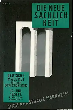 Unter dem Programm gewordenen Ausstellungstitel „Neue Sachlichkeit. Deutsche Malerei seit dem Expressionismus“ fasste Gustav Friedrich Hartlaub, Leiter der Kunsthalle Mannheim, 1925 die führenden Vertreter – einschließlich des eine Sonderrolle einnehmenden Max Beckmann – in einer Wanderausstellung zusammen. Die stark beachtete Schau mit „nach-expressionistischer“ Kunst brachte unterschiedliche Künstlerpersönlichkeiten auf einen Nenner.[7] Ausgehend von der Vorstellung einer krisenhaften Gegenwart unterteilte Hartlaub die Neue Sachlichkeit in einen veristisch-gesellschaftskritischen Flügel und einen eher klassisch-konservativen Flügel, die im Sinne einer Kritik- und Fluchttendenz auf die als Krise wahrgenommene Umbruchszeit seismographisch reagierten.