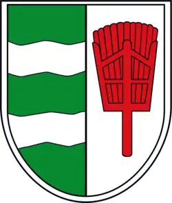 Blasonierung:Gespalten; vorn: in Grün zwei silberne Wellenbalken; hinten: in Silber ein roter Feuerbesen.“[28]