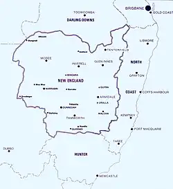 Die beiden traditionellen Zentren Neuenglands sind Armidale und Tamworth. In Armidale befindet sich die University of New England, Australiens älteste regionale Universität. Tamworth ist als Zentrum der australischen Country-Musik-Industrie bekannt. Heutzutage allerdings überflügeln die an der Küste wachsenden Zentren Ballina, Coffs Harbour und Port Macquarie diese inländischen Zentren.
