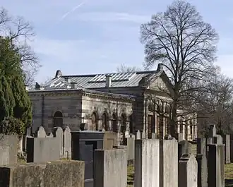 Die 1901/02 erbaute Trauerhalle wurde von dem renommierten Fürther Architekten Adam Egerer im Neorenaissance-Stil entworfen. In dem Gebäude, das nach 1945 mehrmals erneuert wurde, sind seit Juli 1997 die Namen von 890 in der Zeit des Nationalsozialismus ermordeten Fürther Juden auf Steintafeln angebracht.[1]