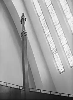 Der Innenraum ist deutlich heller als die Fassade. Er wird durch parabelförmige Betonbinder gegliedert und erhält ausreichend Tageslicht über die von Ervin Bossányi entworfenen großen Seitenfenster. Die Fensterfarben beginnen mit warmen Tönen am Eingang und enden mit kälteren Tönen nahe der Empore für den Sarg. An beiden Stirnseiten gibt es farbige schmale Glasfenster, in denen Heinrich Jungebloedt abstrakt loderndes Feuer und einen Lebensbaum dargestellt hat. Der Schmuck des Innenraums ist betont schlicht gehalten, es gibt nur auf der Ostempore zwei figürliche Darstellungen aus der Werkstatt von Karl Opfermann. Diese beiden Figuren korrespondieren mit den beiden einzigen frei stehenden Skulpturen im Außenbereich. Hier stehen zwei schlanke Bronzefiguren des Bildhauers Ludwig Kunstmann, die auf hochragenden Stäben zu beiden Seiten des Treppenaufgangs platziert sind.