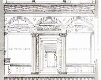 Der Moderne Saal bildete den Abschluss der Gipssammlung und war den Skulpturen der Renaissance bis zum frühen 19. Jahrhundert gewidmet. Sechs Bogenstellungen mit je zwei Säulen aus violett-bräunlichem Marmor mit ionischen Kapitellen trugen die Decke und unterteilten den Raum in sieben kleinere Abteilungen, zusätzlich durch zwischen den Säulen stehende Zwischenwände getrennt. Wie im Griechischen Saal erforderte die Menge der Ausstellungsstücke mehr Hängefläche, gleichzeitig erlaubten sie eine „strengere Sonderung der Kunstwerke nach Schulen und Zeitepochen“.[40] An der Innenwand gegen den Griechischen Hof war pro Abteilung eine Nische mit darüberstehenden Wandmalereien angebracht. Die Haupt- und Zwischenwände waren gelblichbraun getönt, der Sockelbereich violettgrau. Die Malereien im oberen Wandbereich waren in steingrauen Tönen gehalten, einen Farbakzent bildete der blaue Hintergrund der Figuren links und rechts der Nischen. Gurtungen in Arabeskenmalereien zwischen den einander gegenüber stehenden Säulen gliederten die Decke und in den Scheiteln des Mittelganges schilderten sieben achteckige Wandgemälde die Entwicklung der Industrie und der Künste in Allegorien der Landwirtschaft, des Prägewesens, der Bildenden Kunst, der Architektur, der Gold- und Eisenschmiedekunst sowie des Maschinenbaus. Die durchbrochenen Mäntel der Wasserheizungsöfen und die anstoßenden, 90 Zentimeter hohen Wandtische, die die Heizröhren verdeckten, wurden zur Aufstellung größerer und kleinerer Bildwerke genutzt. An der Südwand war ein Abguss der Paradiespforte des Baptisteriums von San Giovanni in Florenz, ein Werk von Lorenzo Ghiberti eingelassen.