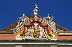 Auf der nördlichen Seite zur Oberstadt hin befindet sich der Schlossplatz mit der ehemaligen Hauptwache. In der Mitte der Rokoko-Schlossfassade ist eine Uhr, die von einer weißen Rokoko-Ornamentik eingerahmt ist. Links sind symbolhaft Sanduhr und Sense abgebildet, rechts der Gott der Zeit, Chronos.[2] An der linken Seite des Schlosses ist der Eingang zur heute evangelisch genutzten Schlosskapelle.