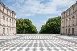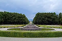 Der Schlosspark ist in seiner heutigen Gestalt eine weitgehend identische Nachahmung der im 17. Jahrhundert von André Le Nôtre geschaffenen westlichen Versailler Hauptachse.[68] Der Schlossgarten in der Mitte der Herreninsel umschließt eine rechteckige Fläche von etwa 120 × 400 Metern, deren östliches Drittel das Schlossgebäude einnimmt. Die gesamte Gartenanlage, die östliche Avenue und der westlich gelegene Stichkanal zum See rahmt eine doppelte Lindenallee. Für die Gestaltung des Schlossparks wurde der königliche Hofgärtner Carl von Effner verpflichtet, ein Schüler des Gartenarchitekten Peter Joseph Lenné. Effner legte die ersten Entwürfe 1875 vor.[44] Wie das Schloss waren die Gartenanlagen in ihrer geplanten Gestalt zwar als Zitat, aber nicht als genaue Kopie des Versailler Vorbildes gedacht,[16] die sich durch die geringen Höhenunterschiede der Insel und den begrenzten Platz auch nicht in vollem Umfang hätte verwirklichen lassen. Effners Entwürfe konnten aus Kostengründen nicht in ihrem geplanten Umfang umgesetzt werden, die Herrenchiemseer Gärten verblieben wie das Schloss unvollendet.