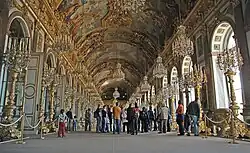 Den Höhepunkt der Paraderäume bildet der große Spiegelsaal, der mit seinen Eckräumen, den Salons des Friedens und des Kriegs, sowohl gestalterisch als auch thematisch eine Einheit bildet. Die Spiegelgalerie hat eine Länge von 75 Metern, womit sie den 73 Meter langen Spiegelsaal in Versailles übertrifft.[28] Die Raumflucht mit den beiden untergeordneten Nebensälen ist 98 Meter lang und belegt damit die gesamte Westseite des Schlosses. Wie beim Vorbild ist auch auf Schloss Herrenchiemsee das von außen sichtbare Attikageschoss der Gartenfassade nur architektonischer Schein, da sich hinter den eckigen Fenstern das Gewölbe des fast 13 Meter hohen Raums befindet. Den 17 großen Spiegeln des Saals stehen 17 Rundbogenfenster gegenüber, die einen Blick auf die Gartenanlagen gewähren. Durch diese Anordnung wird das Licht im gesamten Spiegelsaal reflektiert und bricht sich in den Kristallelementen der 33 Deckenlüster und 44 Standkandelabern. Die Dekoration des Saales besteht neben den Spiegeln, Lüstern und Kandelabern aus vergoldeten Gips- und Holzelementen sowie aus Marmorbüsten römischer Kaiser und den Statuen römischer Götter. Die Deckengemälde sind, abgesehen von kleineren Abweichungen, Kopien der Gemälde aus der Spiegelgalerie von Versailles.[61] Sie zeigen die wichtigsten Kriegszüge Ludwigs XIV. Eine Besonderheit der Deckengemälde besteht im plastischen Schmuck, der nach bayerischer Art an einigen Stellen aus den Gemälden heraustritt und den es im Vorbild nicht gibt.[61]