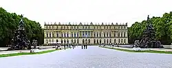 Das Schloss präsentiert sich als Baukörper in einfachen Grundformen. Das Gebäude ist dreigeschossig und besteht aus drei nahezu quaderförmigen Flügeln, die hufeisenförmig einen Ehrenhof umschließen. Auf den nach Westen zur Gartenanlage ausgerichteten, 23-achsigen Mitteltrakt folgen seitlich anschließend der Nord- und der Südtrakt mit jeweils 18 Achsen. Die fast 100 Meter breiten Garten- und die kürzeren Seitenfronten kopieren nahezu exakt das Vorbild des Corps de Logis des Versailler Schlosses[44] und folgen damit dem Stil des Klassizistischen Barocks. Die blockhaften Fassaden vermitteln durch ihre wenig akzentuierte Gestalt einen strengen Eindruck und werden lediglich durch flach aus dem Gebäudekörper hervorspringende, niedrige Risalite aufgelockert. Das Erdgeschoss ist zurückhaltend in schlichten Formen gestaltet, die darüber liegende Beletage mit den Prunkräumen ist durch hohe Bogenfenster, Pilaster und Säulenstellungen betont. Das oberste Stockwerk des Schlosses ist als Attikageschoss ausgeführt und von einer umlaufenden, mit Vasen und Trophäendarstellungen geschmückten Balustrade gekrönt, hinter der sich die flachen Dächer verbergen. Der Figurenschmuck stellt Allegorien der Tugenden, der Wissenschaften, der Berufsstände und der Künste dar.