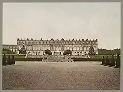 Schloss Herrenchiemsee gehört zu den letzten großen Schlossbauten im deutschen Sprachraum. Das Bauwerk bildet eine nahezu einzigartige Ausnahme in der nachahmungsfreudigen Architekturlandschaft des 19. Jahrhunderts.[17][50][51] Anders als die meisten Werke der Epoche ist es keine romantische Neuschöpfung im Sinne des Historismus wie zum Beispiel Schloss Neuschwanstein oder Schloss Stolzenfels, sondern in seiner äußeren Gestalt eine nur im Detail überarbeitete Nachahmung eines bereits bestehenden Gebäudes. Es ist jedoch auch nicht als reine Kopie zu verstehen,[16] sondern es führt das stilistisch uneinheitliche Vorbild des 17. und 18. Jahrhunderts zu einer dort nicht erreichten Einheit zu Ende.[8] Dem Versailler Vorbild nachgeahmt sind die im Stil des klassizistischen Barocks gestaltete Gartenfassade und die Paraderäume, die auf eklektizistische Weise um die neu geschaffene Hoffassade, die im Stil des Rokoko gehaltenen privaten Wohnräume und die technischen Errungenschaften des 19. Jahrhunderts, wie den versenkbaren Speisetisch und das großzügige Glasdach des Treppenhauses, ergänzt wurden.[52] Obwohl in seiner geplanten Gestalt nicht vollendet, wird das blockhafte Gebäude in seiner heutigen Form als ästhetisch einheitlich beschrieben.[53]